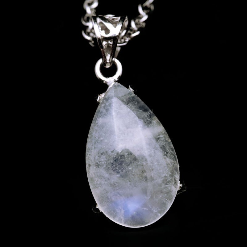 ムーンストーンは長石(フェルドスパー)という鉱物グループの一種。長石グループの石には、ラブラドライト、サンストーン、アマゾナイトなどがあり、同じ仲間とは思えないほど多種多様です。ムーンストーンはオーソクレース(正長石)を主とし、アルバイト(曹長石)を含むものをいい、この二種類の長石の層が重なり合って、光の内部反射と干渉が起こり、「シラー(シーン)」と呼ばれる幻想的な光の効果を見ることができます。