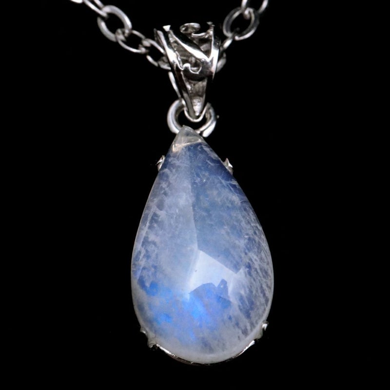 ムーンストーンは長石(フェルドスパー)という鉱物グループの一種。長石グループの石には、ラブラドライト、サンストーン、アマゾナイトなどがあり、同じ仲間とは思えないほど多種多様です。ムーンストーンはオーソクレース(正長石)を主とし、アルバイト(曹長石)を含むものをいい、この二種類の長石の層が重なり合って、光の内部反射と干渉が起こり、「シラー(シーン)」と呼ばれる幻想的な光の効果を見ることができます。